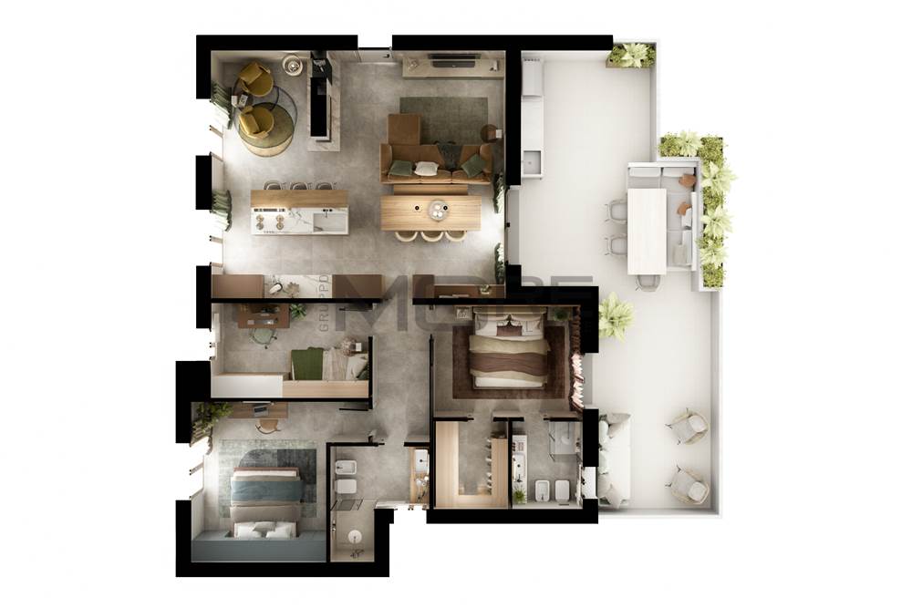soluzione D2 APPARTAMENTO al primo piano composto da ampia zona soggiorno/pranzo con affaccio su loggia coperta, cucina, tre camere da letto, due bagni (di cui uno en-suite), garage e posto auto coperto.