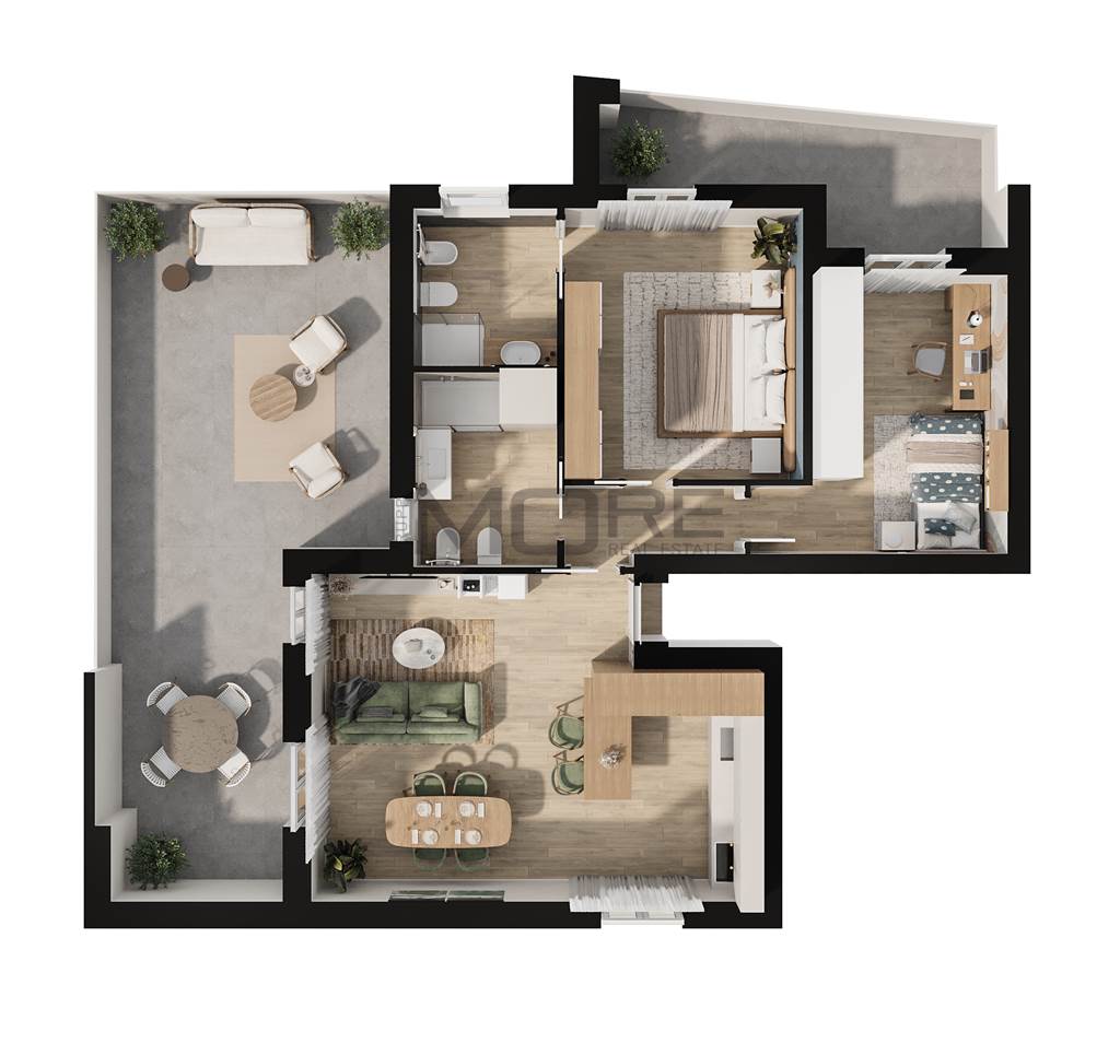 SOLUZIONE A5: appartamento al secondo piano composto da sala con cucina a vista e affaccio su balcone e ampia terrazza, camera matrimoniale, camera singola, 2 bagni, autorimessa e posto auto coperto.