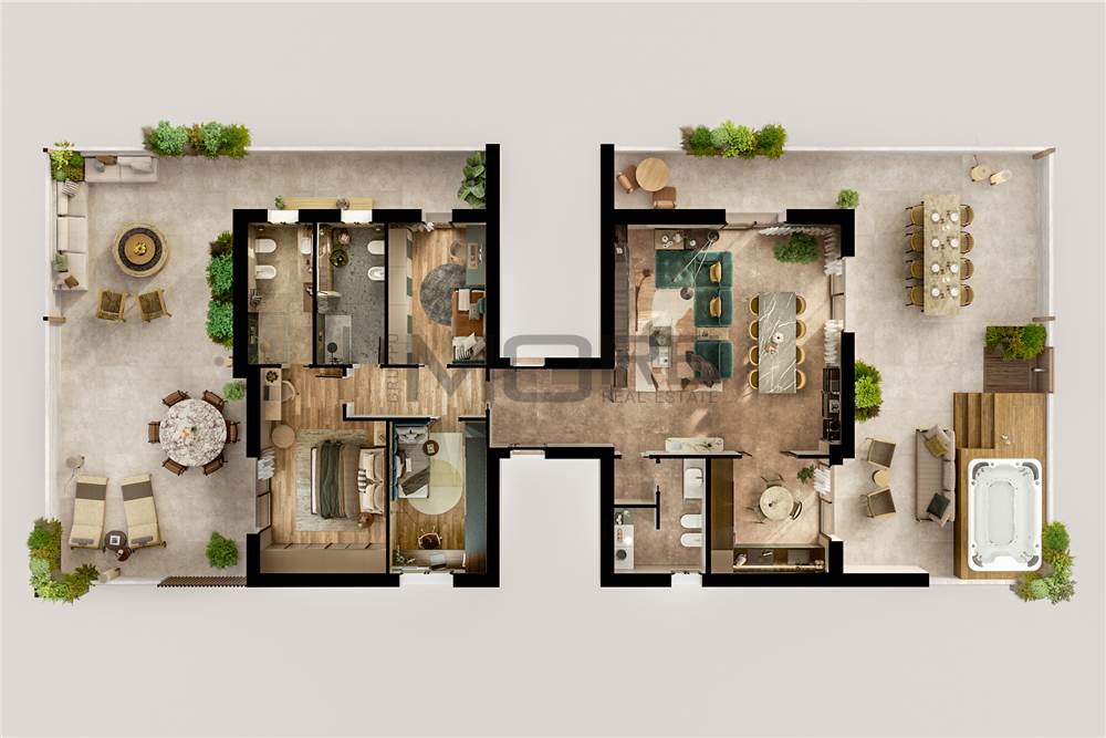 Ogni edificio è composto da 2 maisonettes con giardino e piscina privata, due appartamenti e un attico.