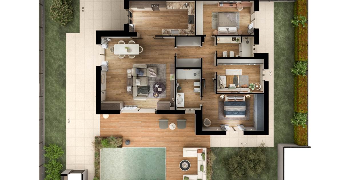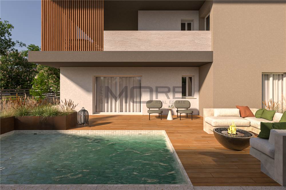 Ogni edificio è composto da 2 maisonette con giardino e piscina privata, due appartamenti e un attico.