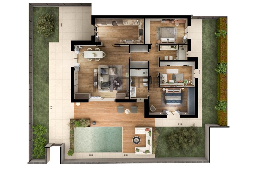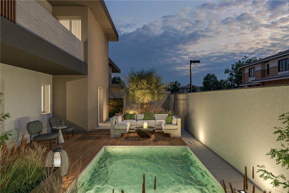 -al piano terra ampia zona soggiorno/pranzo, cucina, 3 camere da letto, 2 bagni (di cui 1 en-suite), 2 ripostigli, giardino, patio con open-air lounge e piscina