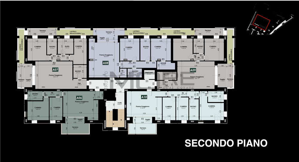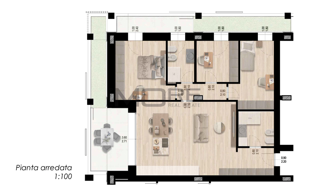 App.to così disposto: ingresso, soggiorno con sbocco sul terrazzo e giardino pensile, cucina a vista, bagno cieco, dis. notte, due camere da letto, uno studio, bagno finestrato e secondo terrazzo con giardino pensile.