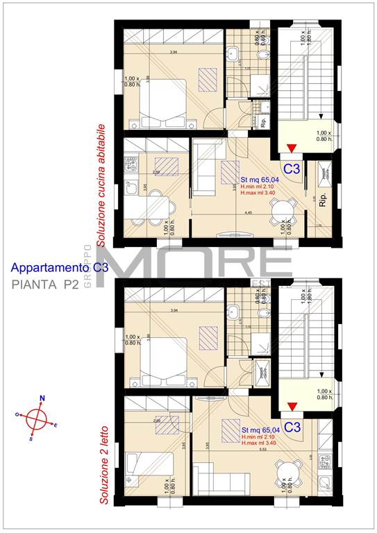 Immobile mansardato con travi a vista (altezza minima 2.10 mt) così disposto: ingresso, soggiorno con cucina a vista, camera singola, dis., camera matrimoniale e bagno.