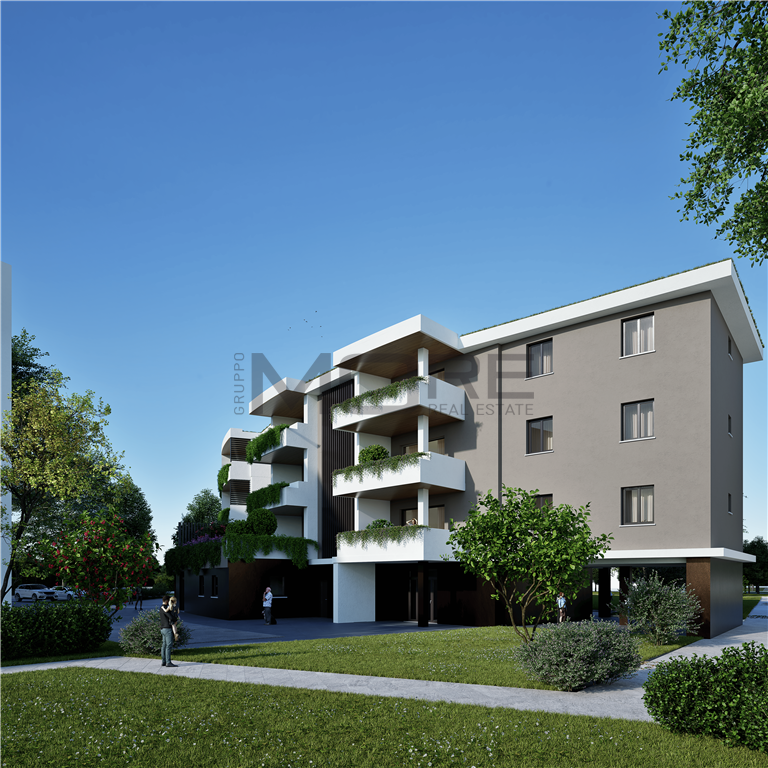 Appartamento così disposto: soggiorno/pranzo con cucina a vista, loggia coperta, giardino pensile, disimpegno, 2 camere da letto, due bagni (di cui uno cieco) e ripostiglio.