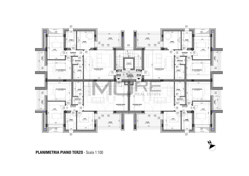 Appartamento così disposto: soggiorno/pranzo, loggia, cucina, disimpegno, due camere da letto (di cui una dotata di loggia), due bagni e ripostiglio.