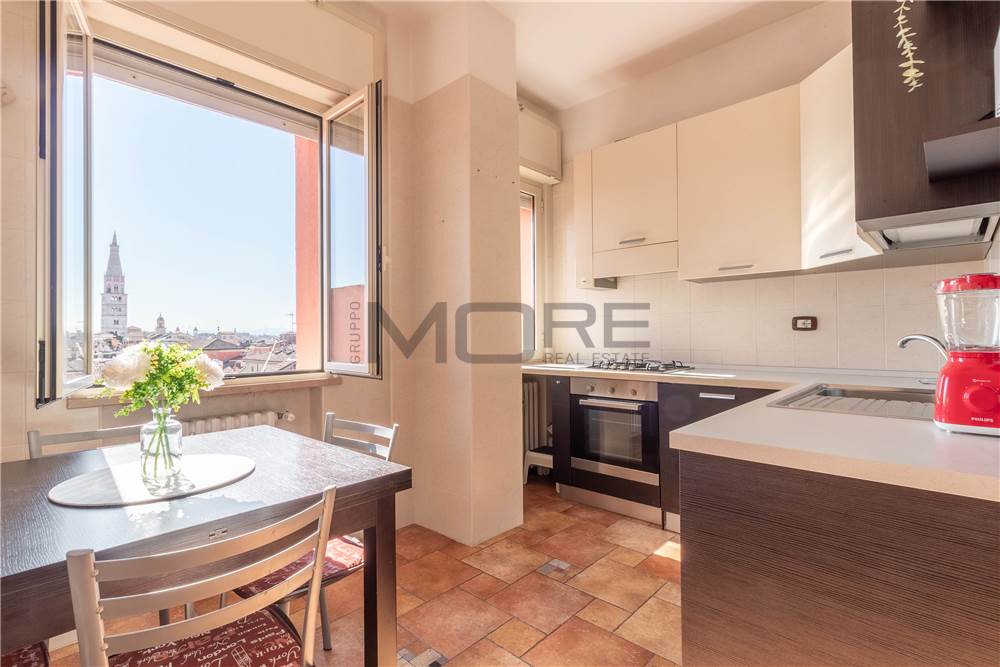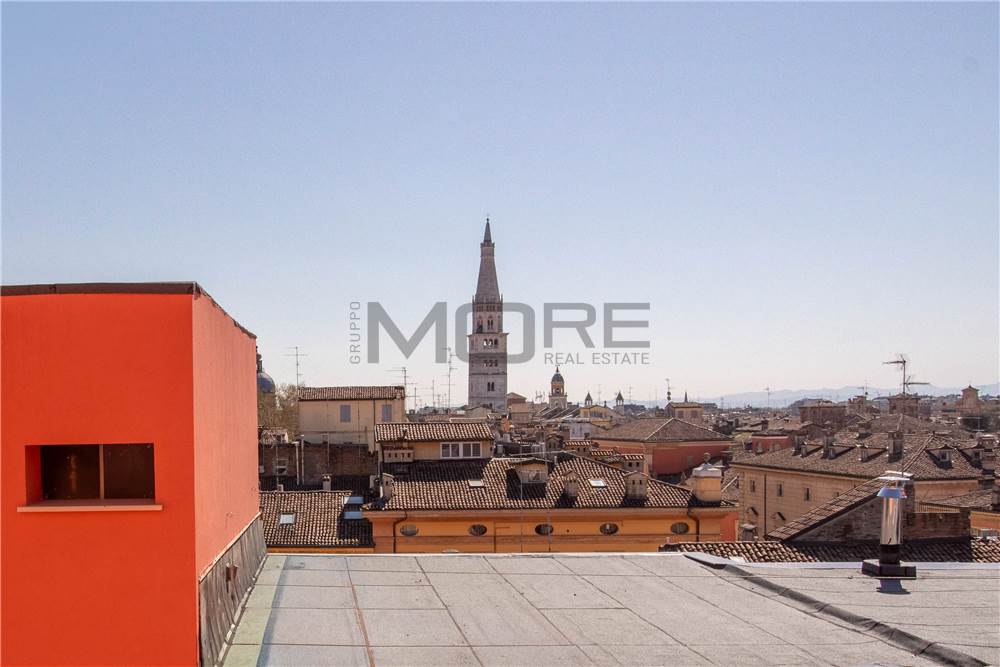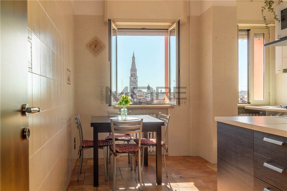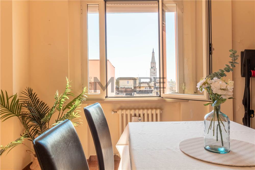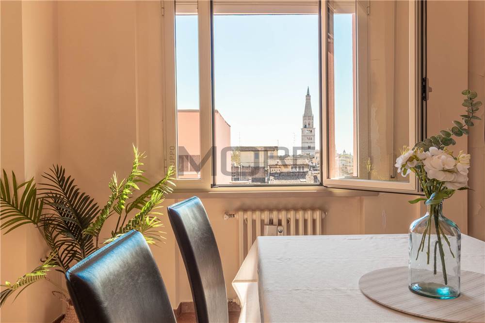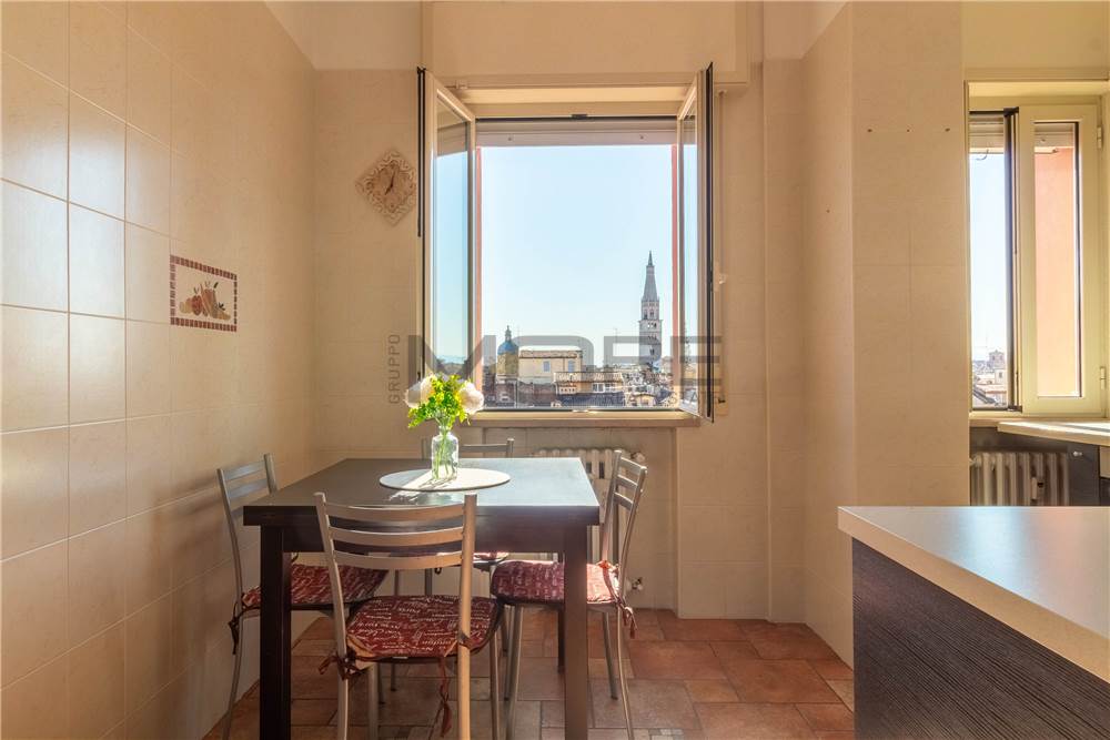 VC1905 Vendiamo in centro storico a Modena appartamento al sesto piano con ascensore vista Ghirlandina, luminoso e arieggiato con affacci unici sui tetti di Modena, entrando troviamo un ampio ingresso che conduce alla zona giorno : salone doppio 2 finestre vista Ghirlandina, cucina abitabile , bagno , 2 camere matrimoniali, 1 balcone e una cantina al piano terra.