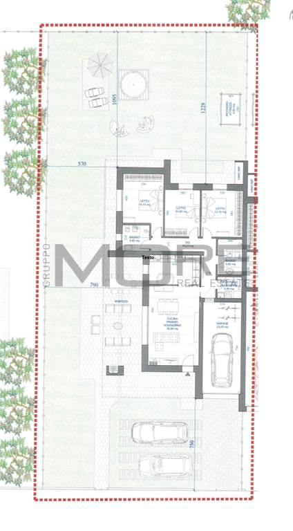 Piano Terra: ingresso su soggiorno con angolo cottura, due bagni, disimpegno, tre camere (due camere matrimoniali e una camera singola). Adiacente ampio garage. Possibilità personalizzazione. Classe A