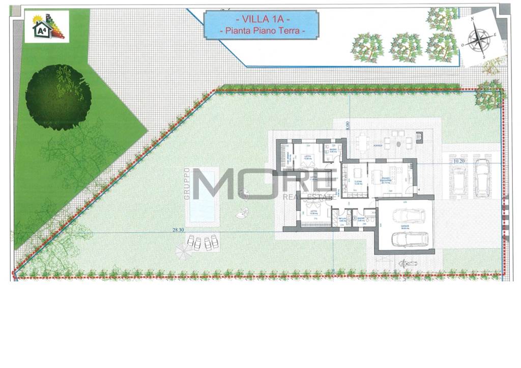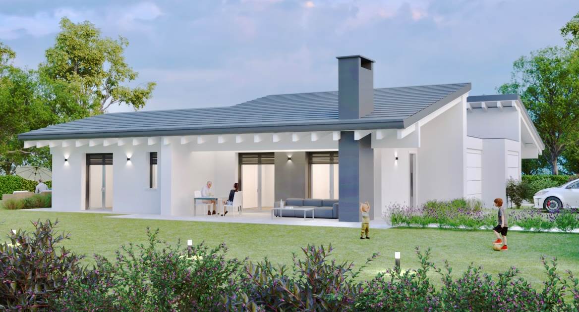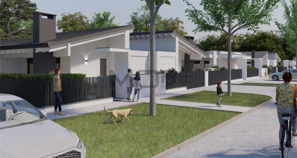 Piano Terra: ingresso su soggiorno, cucina abitabile, due bagni, disimpegno, tre camere (due camere matrimoniali e una camera singola) di cui una con cabina armadi, ripostiglio/lavanderia. Garage doppio. Classe A4. Consegna 2027.