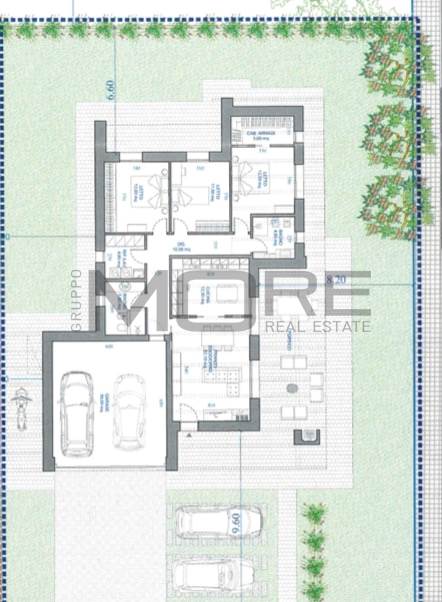 Piano Terra: ingresso su soggiorno, cucina abitabile, due bagni, disimpegno, tre camere (due matrimoniali e una singola) di cui una con cabina armadi, ripostiglio/lavanderia. Garage doppio. Consegna 2027.