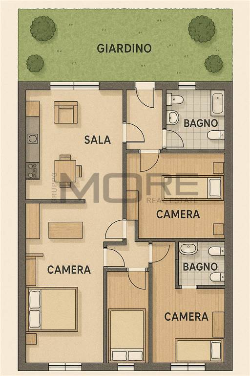Situato al piano terra, all'interno, troverai un'accogliente sala, un cucinotto attrezzato e ben tre camere da letto, insieme a due bagni