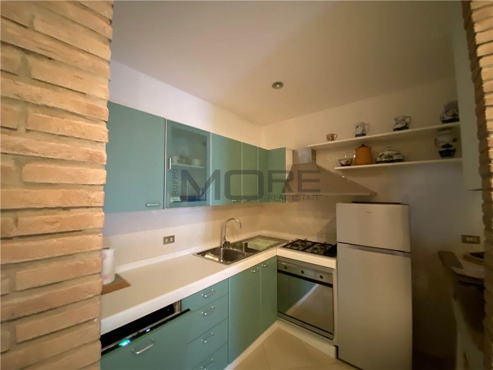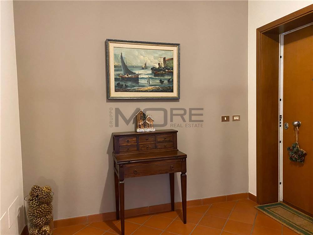 Composizione: soggiorno con angolo cottura, terrazzo di 10 mq, perfetto per pranzi all’aperto, armadio a muro nel disimpegno, bagno finestrato, tre camere da letto, di cui due in mansarda con travi a vista