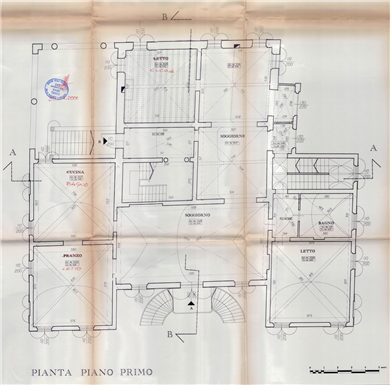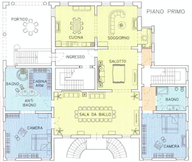 Al piano primo si trova l'appartamento nobile contraddistinta da una grande sala centrale (sala da ballo), salotto soggiorno, cucina, 2 camere, 2 bagni.