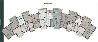Appartamento così disposto: soggiorno/pranzo con cucina a vista, loggia coperta, giardino pensile, disimpegno, 2 camere da letto, due bagni (di cui uno cieco) e ripostiglio.