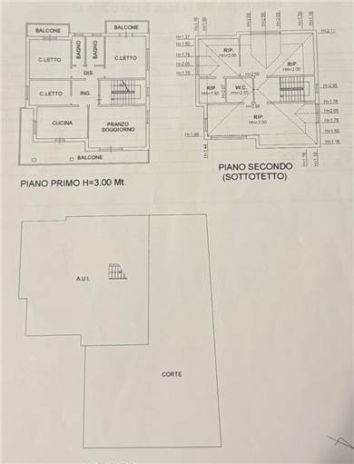 2° piano: appartamento composto da cucina abitabile, sala con camino, 3 camere, doppi servizi, 3 balconi.