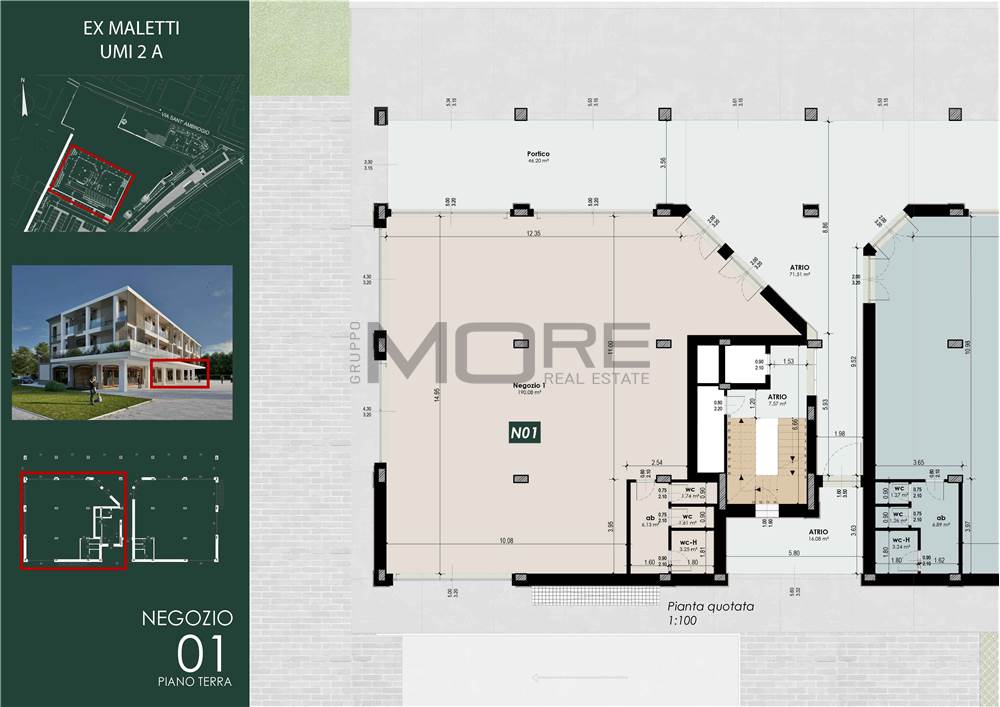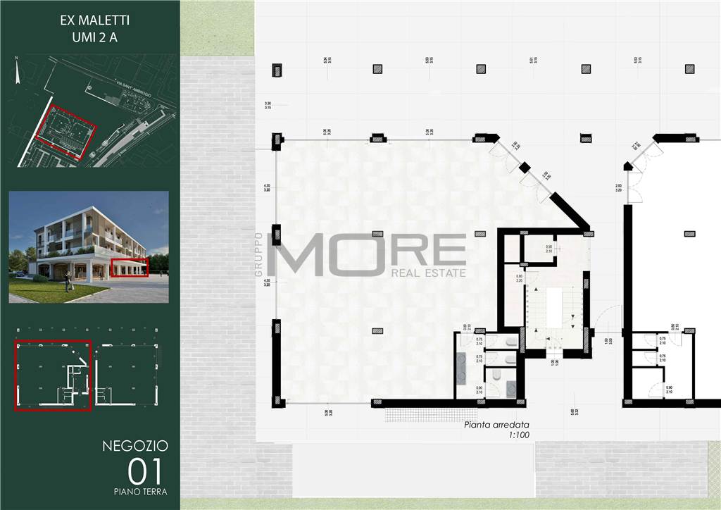 MO860D-UMI2A(N01). Nostra esclusiva, Casinalbo, Borgo San Luigi - Ex Salumificio Maletti, in angolo verde comodo a tutti i servizi prossima realizzazione di comparto residenziale (Classe Energetica A4 - NZEB) composto da nr. 9 palazzine e due ville indipendenti. Al piano terra della palazzina UMI2A vendesi negozio "N01" di 235 mq. con ampie vetrate e affaccio su piazza.